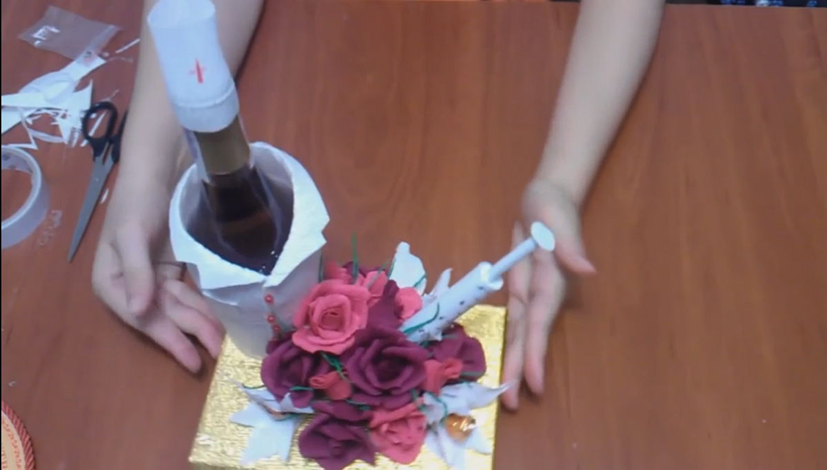 Украшение бутылки в стиле "подлечись" - делаем подарочную бутылку своими руками. Упаковка подойдет на праздник день медицинского работника, да и просто с дикой похмелюги ради хохмы.